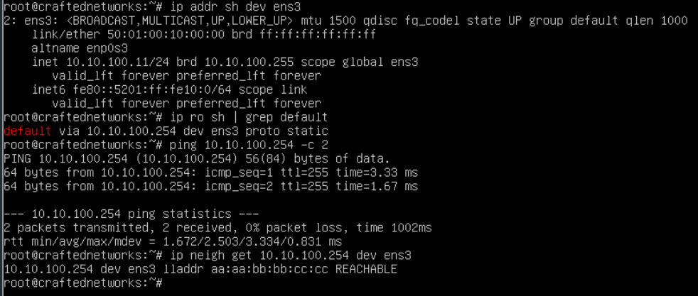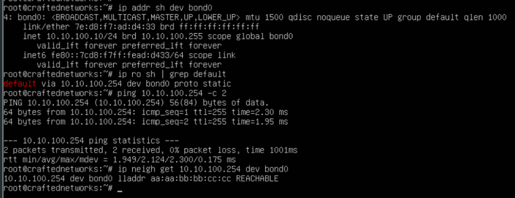 First output shows that server connected with port-channel can reach its default gateway configured as an L3 interface on the leaf switch. Interesting part here is the ARP record pointing to our Anycast Gateway MAC we have configured during previous steps.